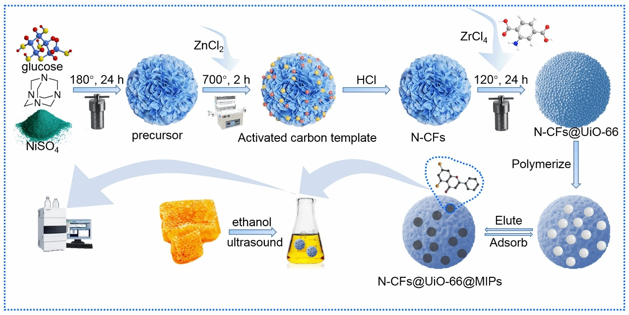在针对蜂胶中白杨素的提取研究中,基于花瓣状碳球构建了UiO-66修饰的氮掺杂分子印迹聚合物材料N-CF@UiO-66@MIPs。以氮掺杂的多孔碳花为载体,在其表面原位生长金属有机框架(UiO-66),并包覆印迹层,形成具有高比表面积、大孔容和丰富识别位点的复合吸附剂。该印迹吸附剂材料展现出优异的吸附容量117.6 mg g-1)和显著的选择性(IF=3.73),并拥有良好的抗干扰与循环使用性能。