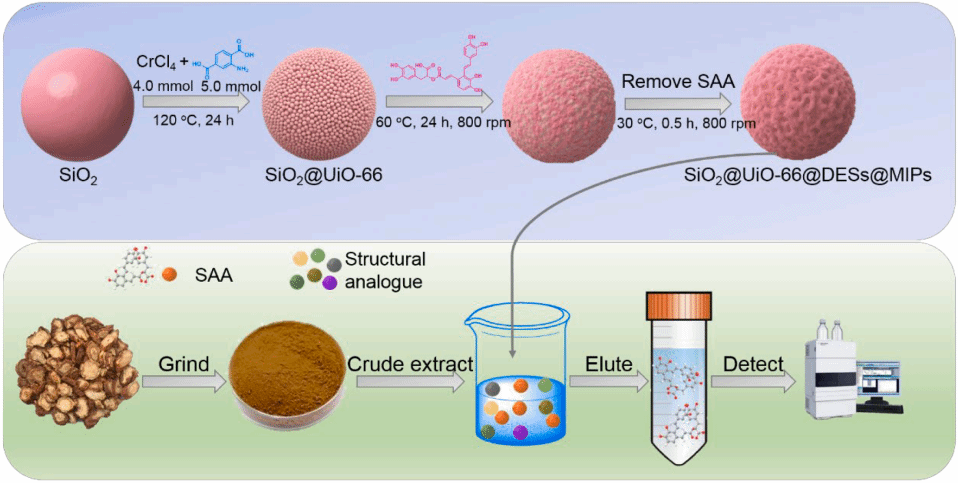 2 印迹吸附剂 SiO2@UiO-66@DESs@MIPs合成路线及选择性富集丹酚酸A