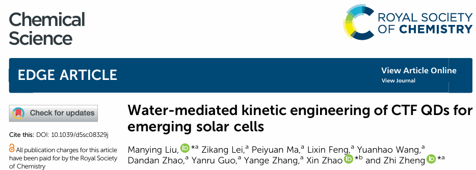 附全文信息:Manying Liu, Zikang Lei, Peiyuan Ma, Lixin Feng, Yuanhao Wang, Dandan Zhao, Yanru Guo, Yange Zhang, Xin Zhao, Zhi Zheng, Water-mediated kinetic engineering of CTF QDs for emerging solar cells. Chemical Science, 2025, DOI: 10.1039/d5sc08329j.