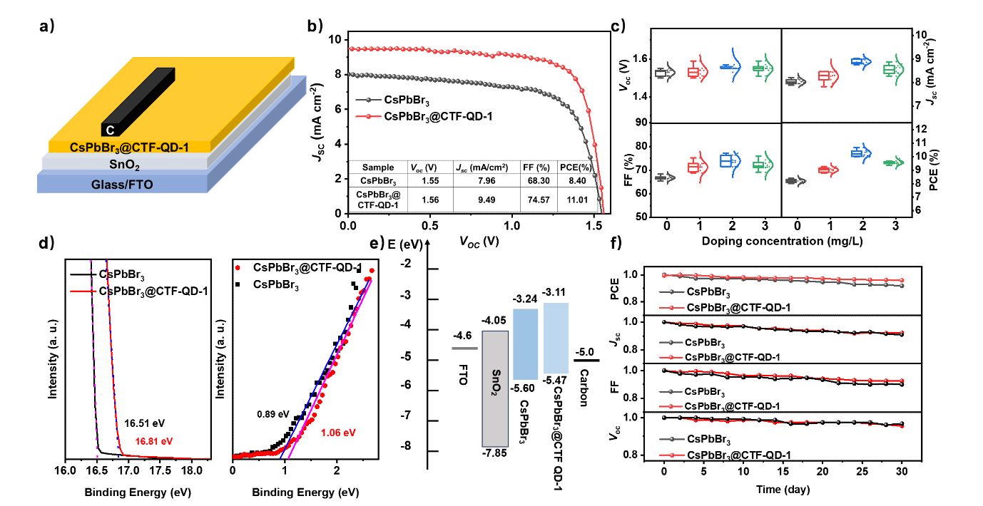研究团队将CTF-QD-1应用于全无机钙钛矿(CsPbBr3)太阳能电池中,通过吡啶氮和羰基氧与Pb2+的协同配位作用,实现了界面缺陷的有效钝化和结晶过程的精确控制,最终将电池效率从8.40%提升至11.01%——相对提升31%。该项工作以“Water-mediated kinetic engineering of CTF QDs for emerging solar cells”为题发表在Royal Society of Chemistry旗下国际期刊《Chemical Science》上。