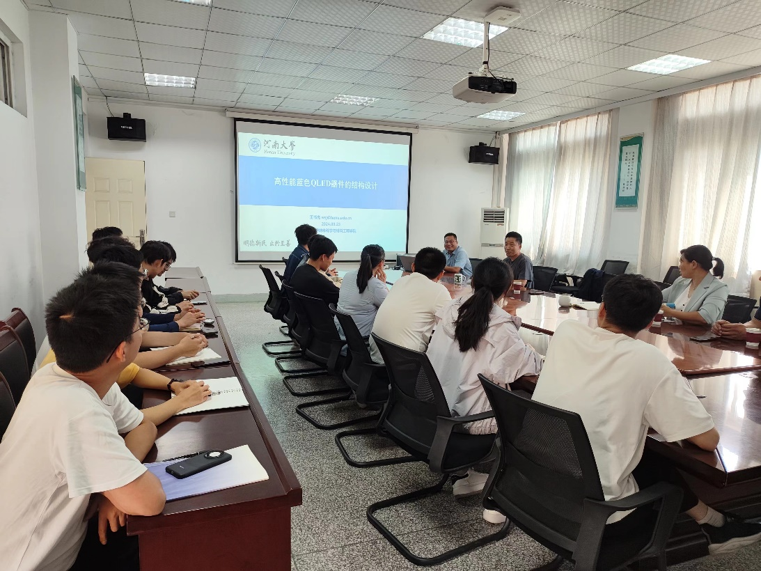 9月23日上午,河南大学博士生导师王书杰教授应邀来我院进行学术交流,并做了题为“高性能蓝色QLED器件的结构设计”的学术报告,本次报告由表面微纳米材料研究所所长何伟伟教授主持,副所长法文君教授及相关领域教师、研究生和本科生聆听此次报告。