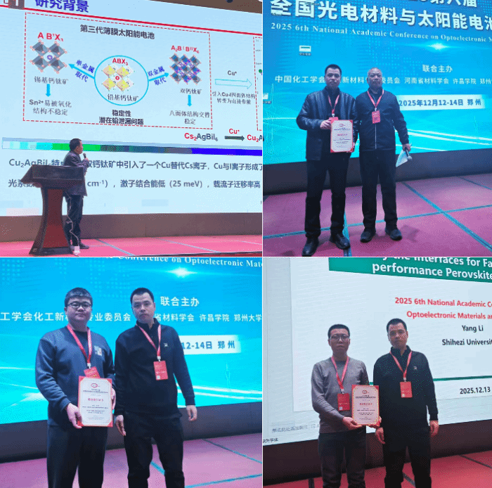 会议期间,刘满营副教授受邀作题为《Cu-Ag-Bi-I薄膜太阳能电池:无铅低毒光伏材料的新机遇》的学术报告。报告系统介绍了团队在新型无铅低毒光伏材料设计、制备及器件优化方面的创新成果,展示了许昌学院在绿色能源材料领域的特色优势,引发了与会专家的广泛关注与讨论。