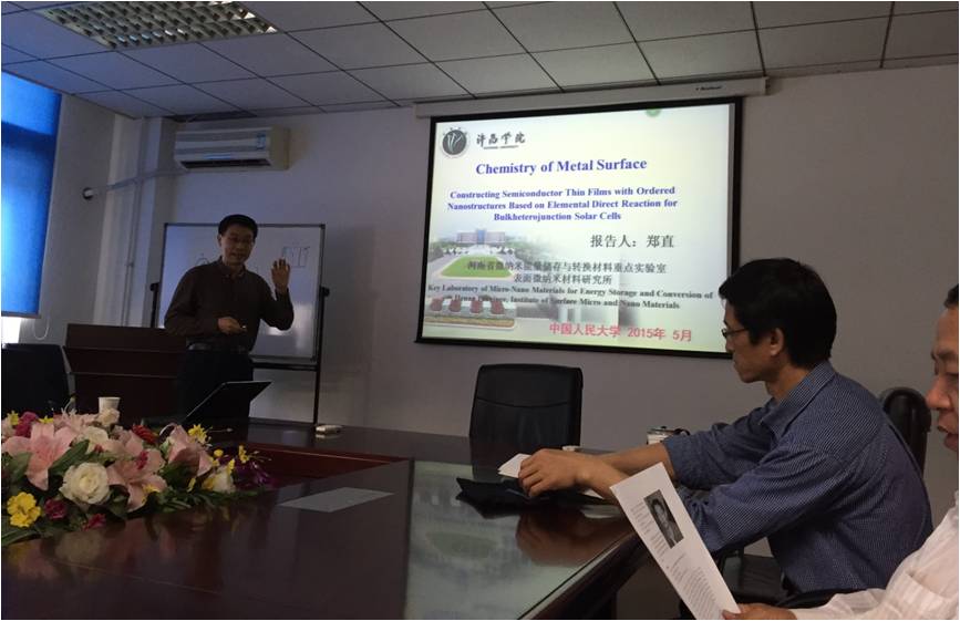 2015年5月5日至6日,受中国人民大学化学系邀请,我校副院长郑直教授、雷岩和何伟伟博士到中国人民大学化学系进行访问交流。郑直教授为中国人民大学化学系师生作了一场题为“Chemistry with Metal Surface—Constructing Semiconductor Thin Filmswith Ordered Nanostructures Based on Elemental Direct Reaction forBulkheterojunction Solar Cells”的学术报告,引起在座师生的浓厚兴趣。中国人民大学化学系张建平教授课题组和艾希成教授课题组分别汇报了他们近期的实验进展。双方围绕太阳能电池和光催化反应中电荷产生和传输动力学行为研究进行了深入讨论并确立了具体的合作方向。