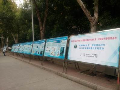 2). 举办纳米技术前言科普展。9月19日-25日,在许昌学院文渊路(表面微纳米材料研究所门前大路)上进行纳米技术前言科普展,共展出宣传版面10个,主要介绍了纳米科技在日常生活、信息领域、医疗保健以及军事国防领域的应用,吸引了公众驻足观看了解。