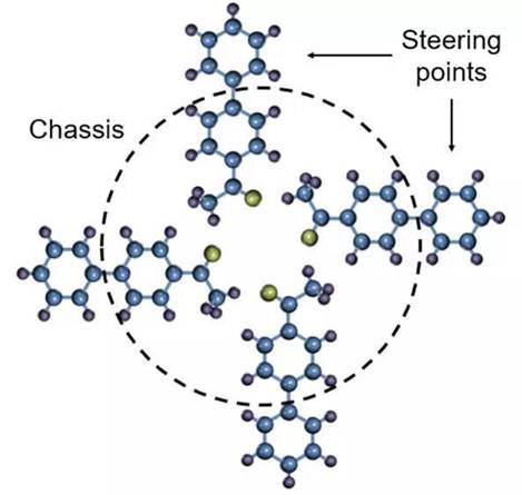 他们的车更大、更像是车,有正儿八经的底盘,还有轮子,名字叫Green Buggy——绿色沙漠车。该车的化学名可以写上10行,简单来讲就是184个碳原子和116个氢原子。电流通过的时候,会刺激“轮子”旋转,像一个真车一样往前开!(这个也跟诺贝尔化学奖介绍的那个可以转动的轮子是有点相通的)