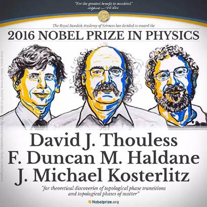 2016年诺贝尔物理学奖,授予戴维·索利斯(David Thouless),与邓肯·霍尔丹(Duncan Haldane )和迈克尔·科斯特利茨(Michael Kosterlitz),以表彰他们在理论上发现了物质的拓扑相变和拓扑相。拓扑学是三位得奖者能做出这一成就的关键,它解释了为什么薄层物质的的电导率会以整数倍发生变化。