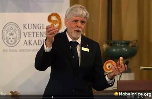 万万没想到,诺贝尔颁奖典礼上会出现一袋子面包——组委会用没有洞的肉桂卷(cinnamon bun)、一个洞的面包圈(bagel)和两个洞的碱水面包(pretzel)解释起了拓扑是怎么回事,在拓扑上,这几种结构是完全不一样的:洞的数量不同。